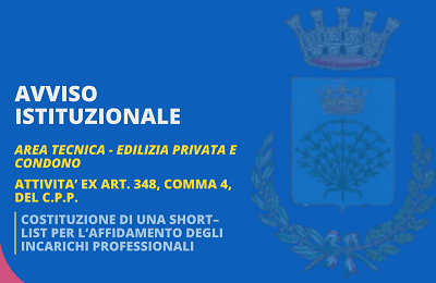 Il Responsabile del Servizio rende noto che questo Comune, giusta Determina n°99/2022 del 09/02/2022, intende procedere alla costituzione di un ELENCO di candidati esperti in possesso dei titoli professionali, abilitati allo svolgimento dei servizi tecnici, ai quali poter conferire, ai sensi dell'art. 36 c.2 lett. a) del D.Lgs. 50/2016, e per le finalità di cui all'Art. 348, comma 4, del C.P.P., incarico, di importo stimato comunque inferiore a €5.000,00 oltre IVA e CNP, di: Esecuzione sopralluogo di accertamento tecnico in materia di abusivismo edilizio a supporto degli Organi di Polizia Giudiziaria, redazione del relativo Verbale di Sopralluogo - Accertamento Tecnico, ed attività connesse.