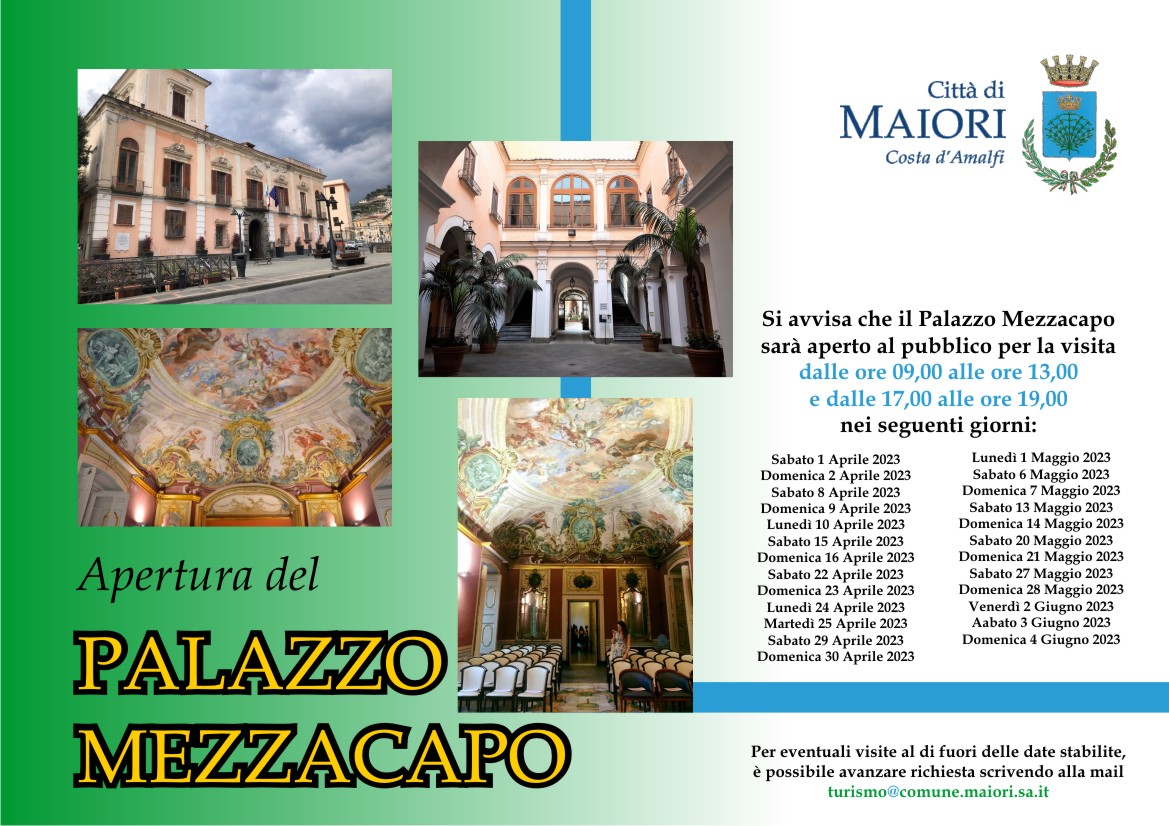 Si avvisa che il Palazzo Mezzacapo sarà aperto al pubblico per la visita dalle ore 09,00 alle ore 13,00 e dalle 17,00 alle ore 19,00 nei seguenti giorni: