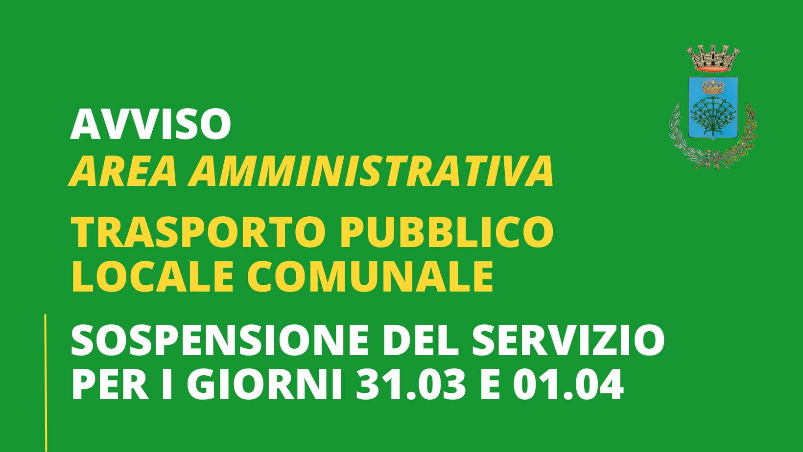 Si avvisa l'utenza che il servizio di trasporto pubblico locale comunale (Tpl) sarà sospeso per i giorni 31 Marzo e 1 Aprile p.v..