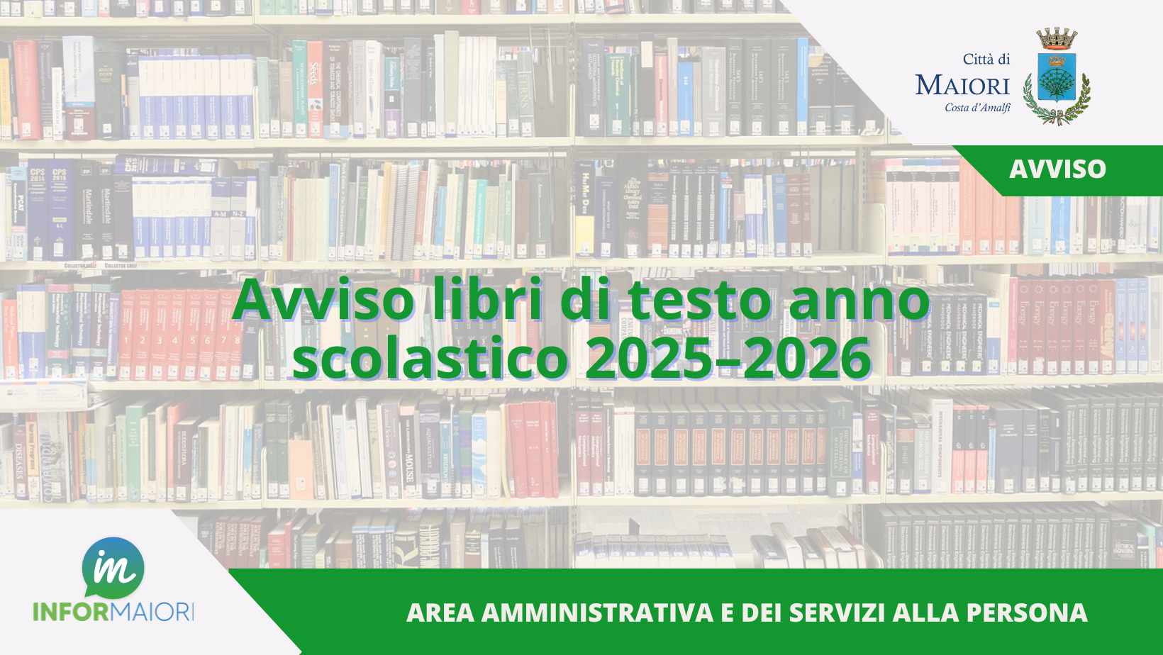 Si informano i gentili utenti che, con Determina n. 313 del 02/09/2025 - Numero Generale 1111, è stato approvato l'elenco dei beneficiari della fornitura totale o parziale dei libri di testo per le scuole secondarie di I e II grado insistenti nel territorio di Maiori.
