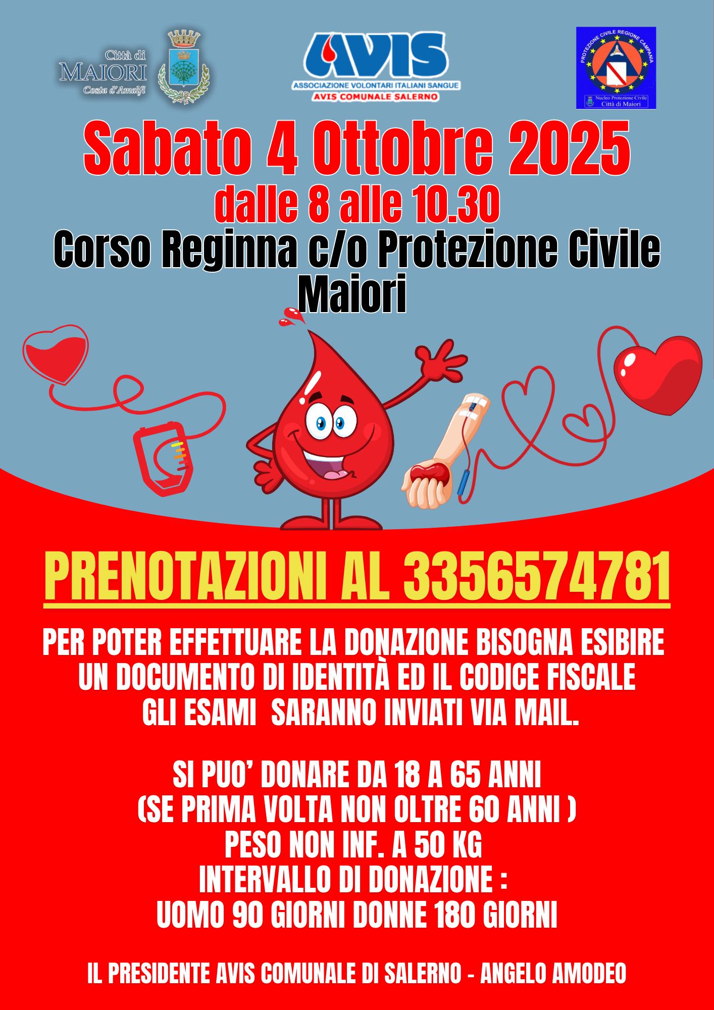 Sabato 4 ottobre p.v. sarà possibile donare il sangue dalle ore 8 alle ore 10.30 nei pressi di Palazzo Mezzacapo nell’area antistante al monumento di San Pio grazie all’Avis Comunale Salerno