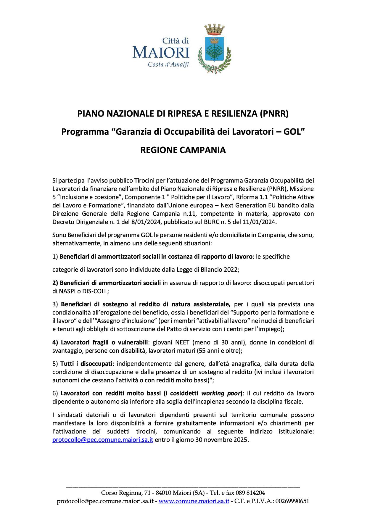 Programma “Garanzia di Occupabilità dei Lavoratori – GOL” REGIONE CAMPANIA. Avviso pubblico Tirocini per l’attuazione del Programma Garanzia Occupabilità dei Lavoratori da finanziare nell’ambito del Piano Nazionale di Ripresa e Resilienza (PNRR), Missione 5 “Inclusione e coesione”, Componente 1 " Politiche per il Lavoro”, Riforma 1.1 “Politiche Attive del Lavoro e Formazione”, finanziato dall’Unione europea – Next Generation EU