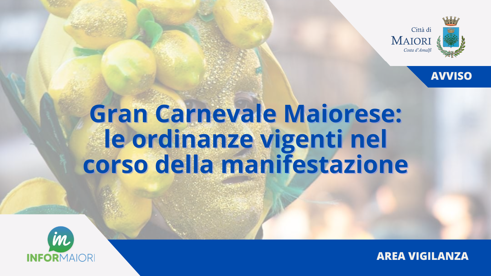 ORDINANZA SINDACALE N. 11 DEL 03/02/2026 - DIVIETO DI USARE BOMBOLETTE SPRAY ED ALTRI ARTICOLI PERICOLOSI E FASTIDIOSI ORDINANZA SINDACALE N. 12 DEL 03/02/2026 - DIVIETO DI VENDITA PER ASPORTO DI BEVANDE CONTENUTE IN BOTTIGLIE E BICCHIERI DI VETRO E RELATIVA DETENZIONE IN OCCASIONE DI MANIFESTAZIONI PUBBLICHE ORDINANZA SINDACALE N. 13 DEL 03/02/2026 - ATTIVAZIONE CENTRO OPERATIVO COMUNALE DI PROTEZIONE CIVILE PER IL 15, 17 E 22 FEBBRAIO 2026 PER LA MANIFESTAZIONE "GRAN CARNEVALE DI MAIORI 2026" CHE SI SVOLGERA' SUL TERRITORIO COMUNALE ORDINANZA N. 14 DEL 12/02/2026 - DISCIPLINA DEL TRAFFICO IN ALCUNE STRADE CITTADINE IN OCCASIONE DELLA MANIFESTAZIONE "GRAN CARNEVALE DI MAIORI 2026" NEI GIORNI 15 - 17 E 22 FEBBRAIO 2026 ℹ️ Resta sempre aggiornato: iscriviti ad InforMaiori