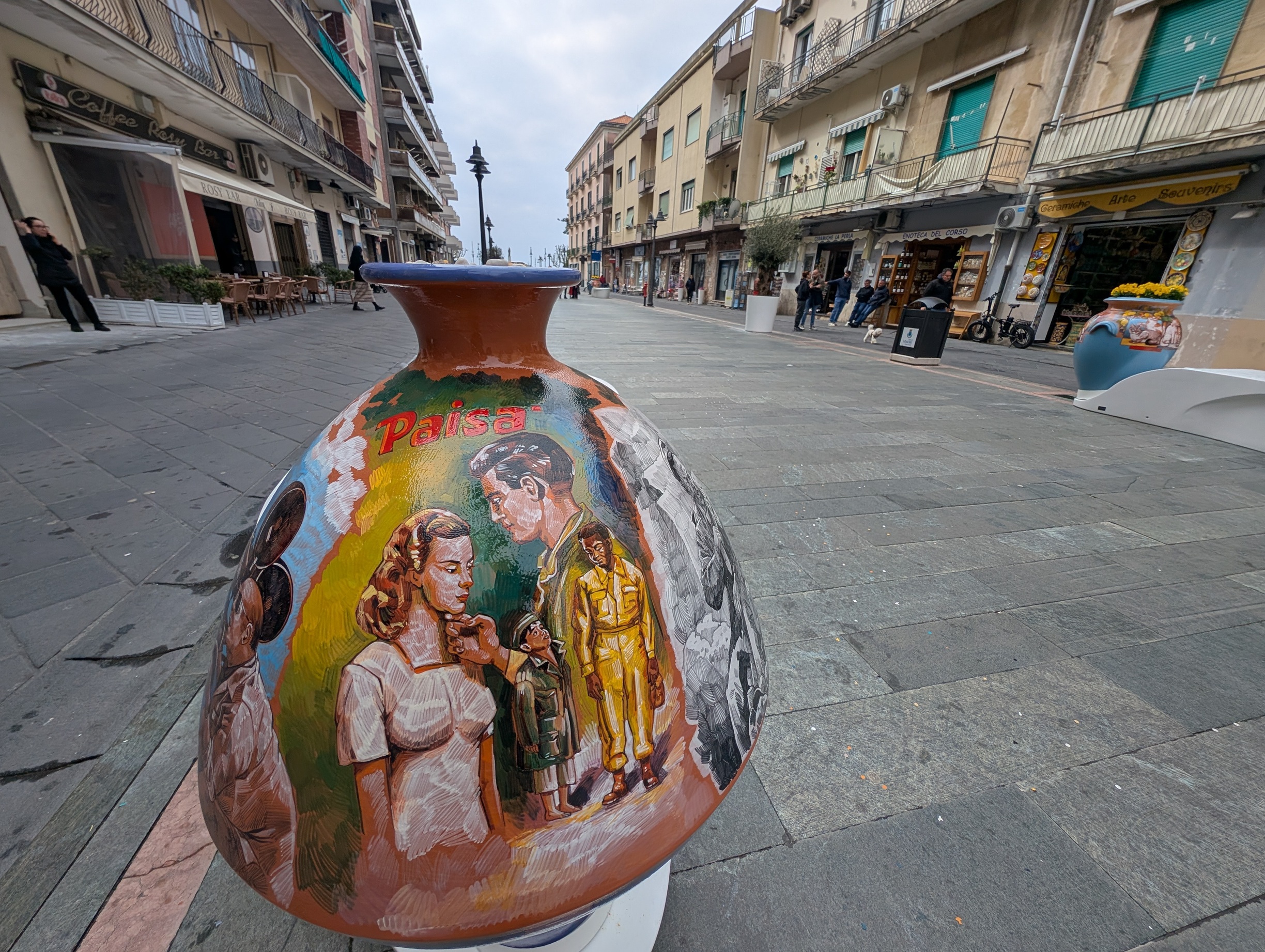 Il vaso dedicato a Paisà intreccia cinema e realtà: Roberto Rossellini e Federico Fellini, il bambino maiorese scelto tra la gente del luogo, la scena delle scarpe donate come gesto di dignità in un’Italia ferita. Maiori diventa set eterno e immagine consegnata alla storia del neorealismo.