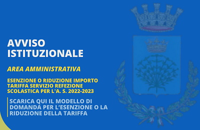 AVVISO - ESENZIONE O RIDUZIONE IMPORTO TARIFFA SERVIZIO REFEZIONE SCOLASTICA PER L'ANNO SCOLASTICO 2022-2023