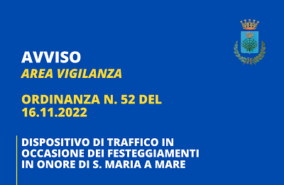 In occasione dei festeggiamenti patronali in onore di Santa Maria a Mare viene disposto il consueto divieto di sosta e di fermata con rimozione forzata nella giornata del 20 Novembre 2022 o, in caso di avverse condizioni meteo, per il giorno 04 Dicembre 2022 nelle seguenti strade: Corso Reginna - Via Roma - Via Nuova Provinciale Chiunzi - Palazzine di Via Gaetano Capone, 25 - Lungomare Amendola - Chiesa San Francesco - Via S. Tecla.