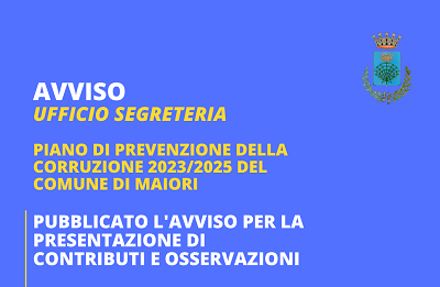PIANO DI PREVENZIONE DELLA CORRUZIONE 2023/2025 DEL COMUNE DI MAIORI. AVVISO PUBBLICO PER LA PRESENTAZIONE DI CONTRIBUTI ED OSSERVAZIONI