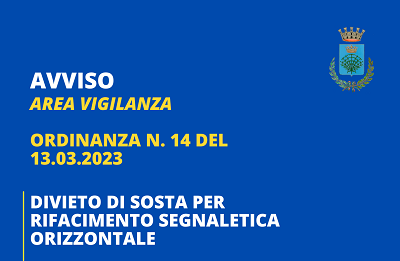 Con l'Ordinanza n. 14 del 13/03/2023 si istituisce il divieto di sosta con rimozione forzata nei tratti di strada interessati dai lavori di rifacimento della segnaletica stradale orizzontale (stalli blu e gialli), nei giorni e negli orari sotto riportati: