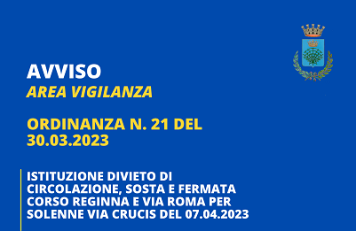 ? Con l'Ordinanza n.21 del 30.03.2023 si istituisce il divieto di circolazione, la sosta e la fermata veicolare, con rimozione forzata, in via Corso Reginna, nei due sensi di marcia, e via Roma per consentire la corretta manifestazione della Solenne Via Crucis dalle ore 20,00 dalla Chiesa Insigne collegiata di Santa Maria Mare, Corso Reginna e fino alla chiesa di San Domenico ubicata in via Roma e comunque fino a cessata esigenza del giorno 07 Aprile 2023.