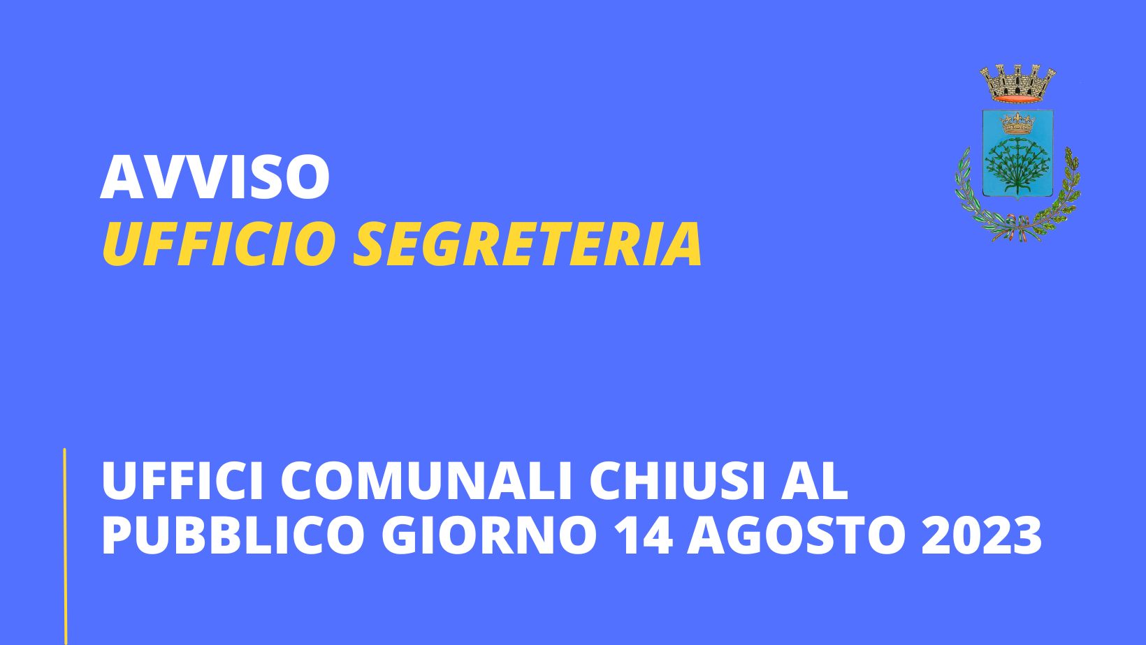 Si informa la cittadinanza che il giorno 14 agosto 2023 gli Uffici Comunali resteranno chiusi al pubblico.