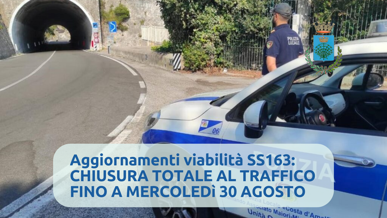 Si comunica che a causa della vigente allerta meteo gialla che sta comportando sul territorio piogge, temporali e vento forte, l'Anas ha deciso la totale interruzione della circolazione stradale sulla statale 163 Amalfitana interessata dai lavori in località Capo d'Orso, dalle 20:00 di oggi lunedì 28 agosto 2023 fino alle ore 16:00 di mercoledì 30 agosto 2023, non sussistendo le condizioni di sicurezza necessarie per la circolazione. Segue ordinanza.
