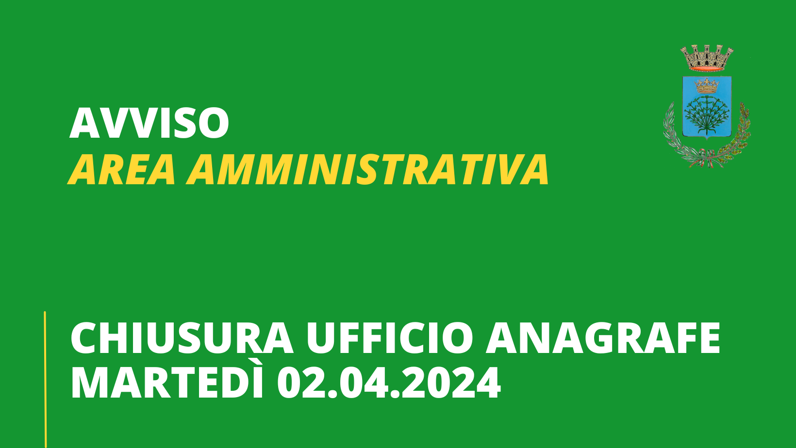 Si informa la cittadinanza che il giorno 2 Aprile p.v. l'Ufficio Anagrafe resterà chiuso al pubblico.
