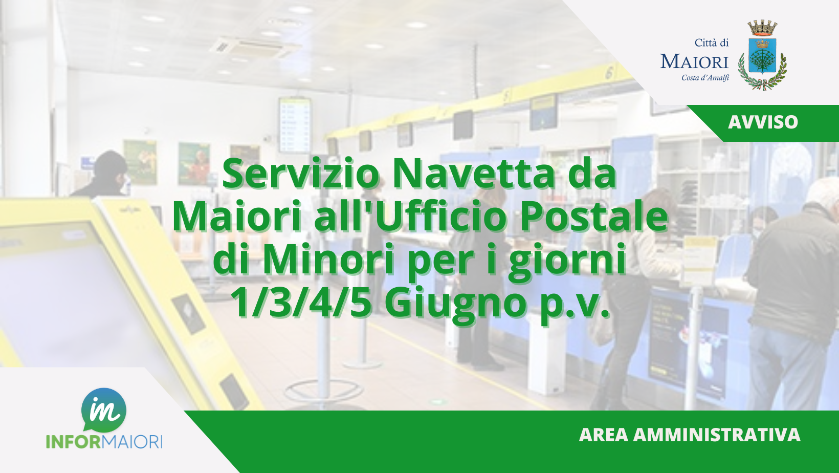 Servizio Navetta da Maiori all'Ufficio Postale di Minori per i giorni 1/3/4/5 Giugno p.v.