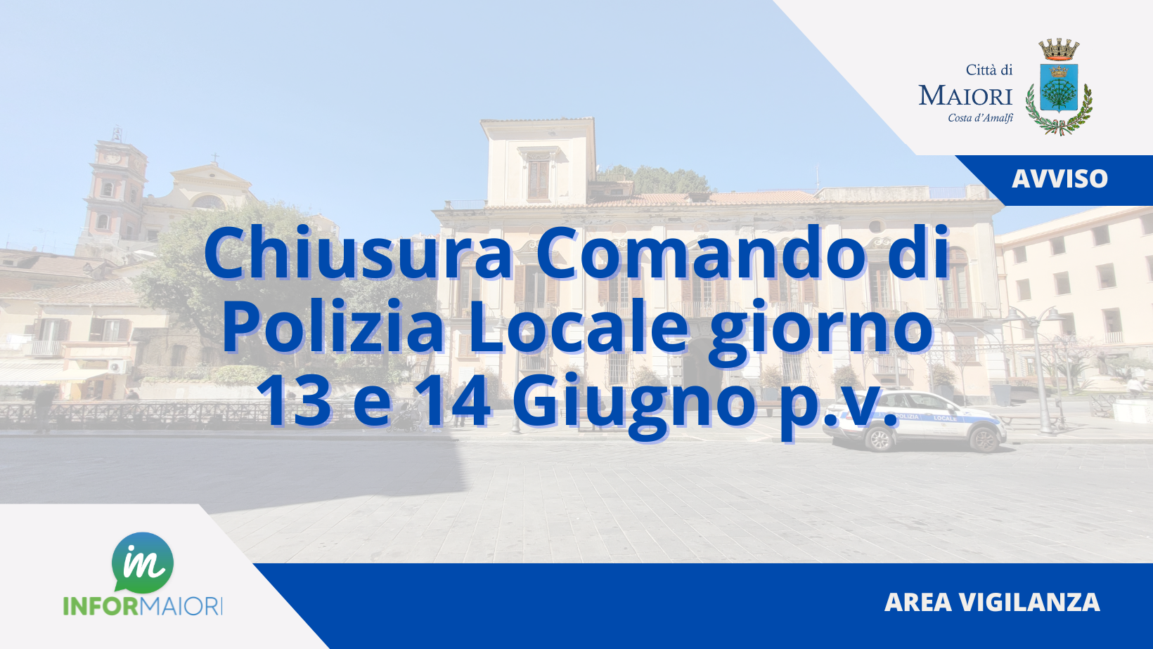 Si informa la cittadinanza che il 13 e 14 Giugno p.v. il Comando di Polizia Locale resterà chiuso al pubblico.