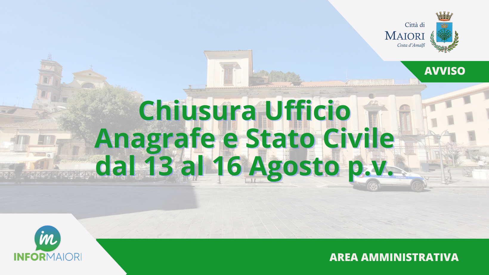 Si informa che dal 13 al 16 Agosto 2024 l'Ufficio Anagrafe e Stato Civile resterà chiuso al pubblico.