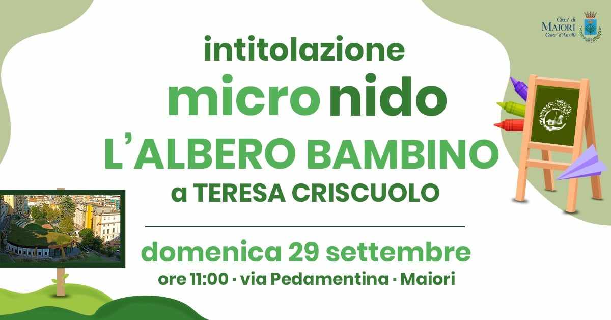 Sarà intitolato a Teresa Criscuolo il micronido Comunale L'Albero Bambino di Maiori. La cerimonia si terrà domenica 29 settembre alle ore 11:00. L'appuntamento sarà non solo un'occasione di ricordo, ma soprattutto una grande festa dedicata ai bambini, così come è sempre stato nello spirito della donna a cui l'istituzione è intitolata.