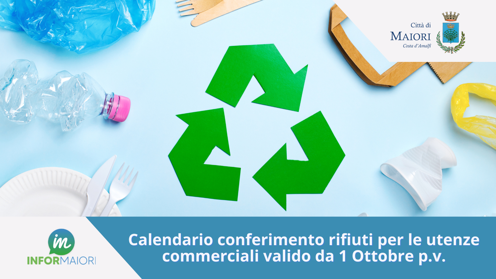 Con ordinanza sindacale del 26.09.2024, il Comune di Maiori informa i cittadini che, dal 01.10.2024 e fino a nuova disposizione, sarà in vigore il nuovo calendario conferimento rifiuti per le utenze commerciali. Si riportano di seguito gli orari e i giorni: