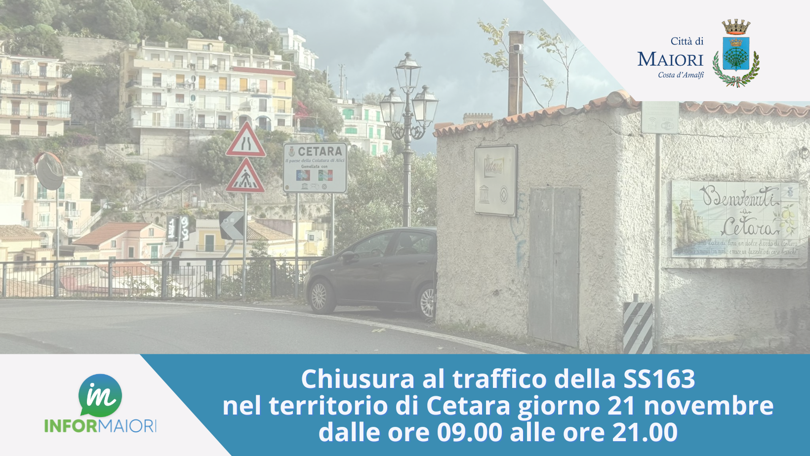 Per consentire l'esecuzione dei lavori straordinari di risanamento del ponte ad arco nel territorio comunale al km 45+000, il Comune di Cetara ha disposto la chiusura al traffico veicolare sulla SS163 amalfitana al km 44+900, in entrambe le direzioni di marcia e su tutte le corsie, per il giorno 21 novembre 2024 dalle ore 09:00 alle ore 21:00, e comunque fino alla conclusione dei lavori.