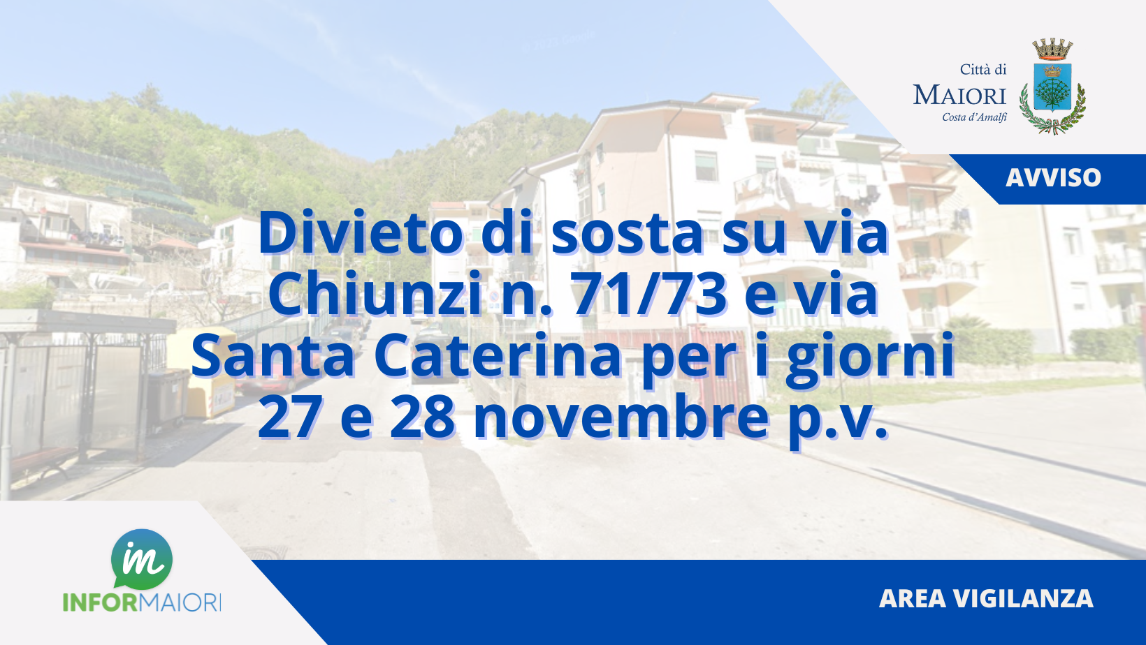 Divieto di sosta via Chiunzi n. 71/73 e via Santa Caterina per taglio erba e pulizia stradale per i giorni 27 e 28 novembre p.v.
