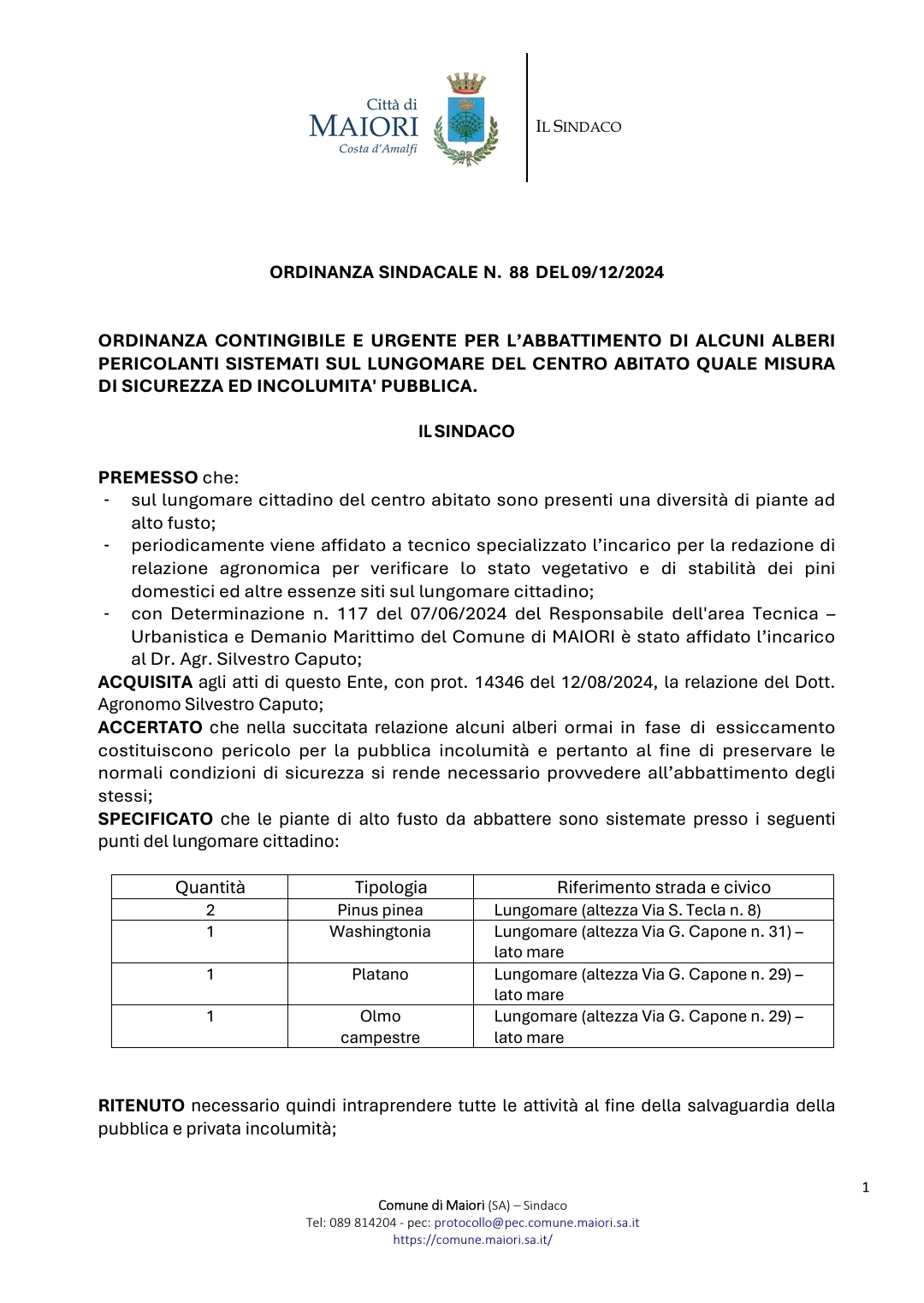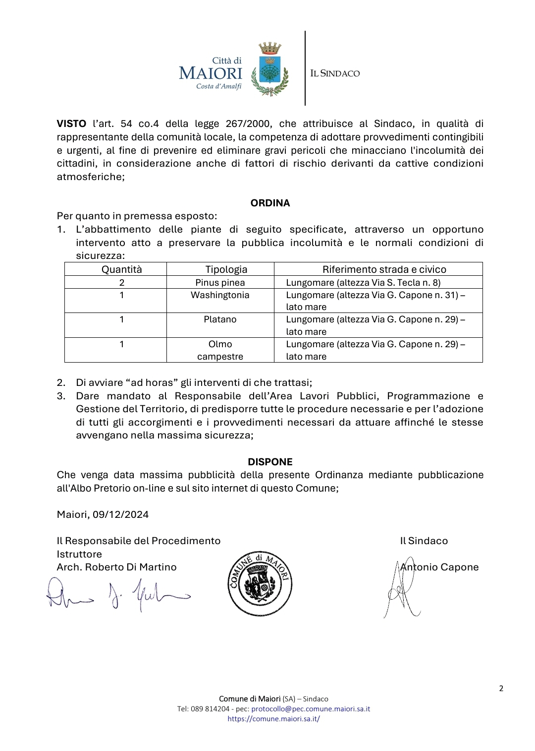 Ordinanza contingibile e urgente per l'abbattimento di alcuni alberi pericolanti sistemati sul Lungomare del centro abitato quale misura di sicurezza ed incolumita' pubblica