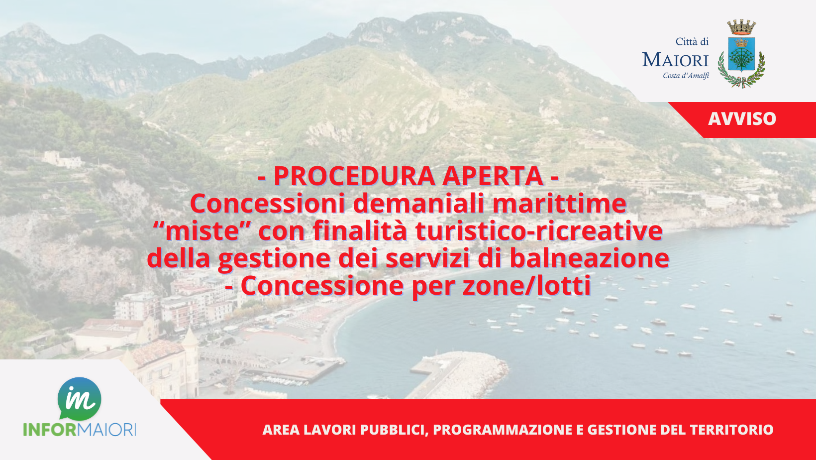 à pubblicato sulla Gazzetta Ufficiale il bando per l'assegnazione delle nuove concessioni balneari. Questo nuovo passo dà ulteriore evidenza ufficiale all'iter burocratico per il rinnovo del litorale maiorese, per il quale è possibile presentare progetti e domande per partecipare alla selezione degli operatori che per i prossimi 11 anni saranno affidatari di stabilimenti lungo il litorale di Maiori nell'area del Lungomare Capone e della frazione Erchie.
