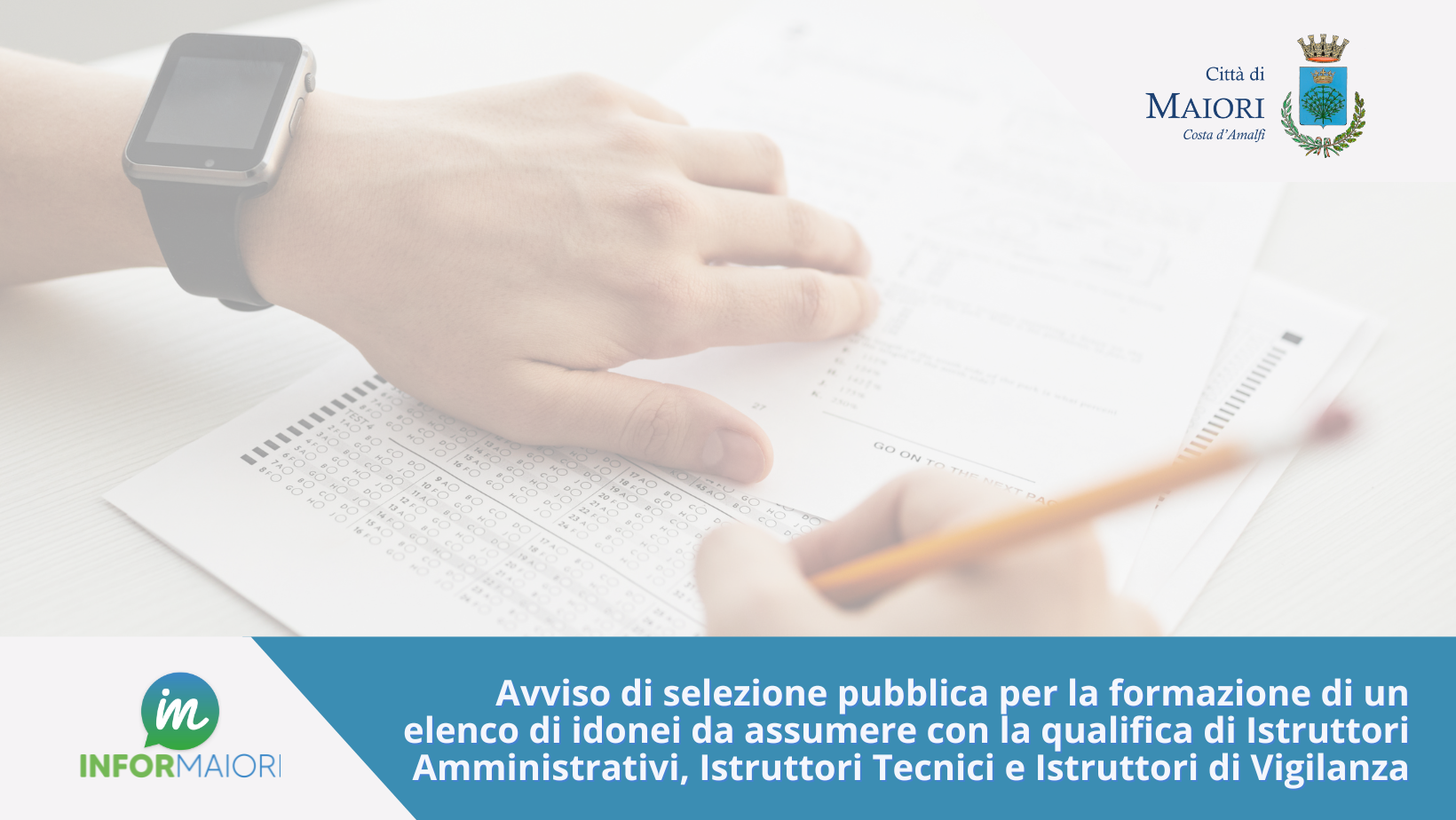 E' indetta una selezione pubblica, per esami, per la predisposizione di un elenco di idonei dal quale attingere per assumere, a tempo indeterminato o a tempo determinato, Istruttori Amministrativi, Istruttori Tecnici e Istruttori di Vigilanza presso il Comune di Tramonti e gli Enti aderenti allo specifico accordo fra cui il Comune di Maiori.