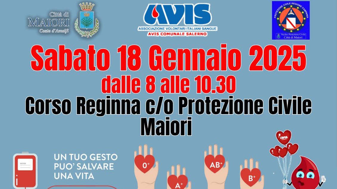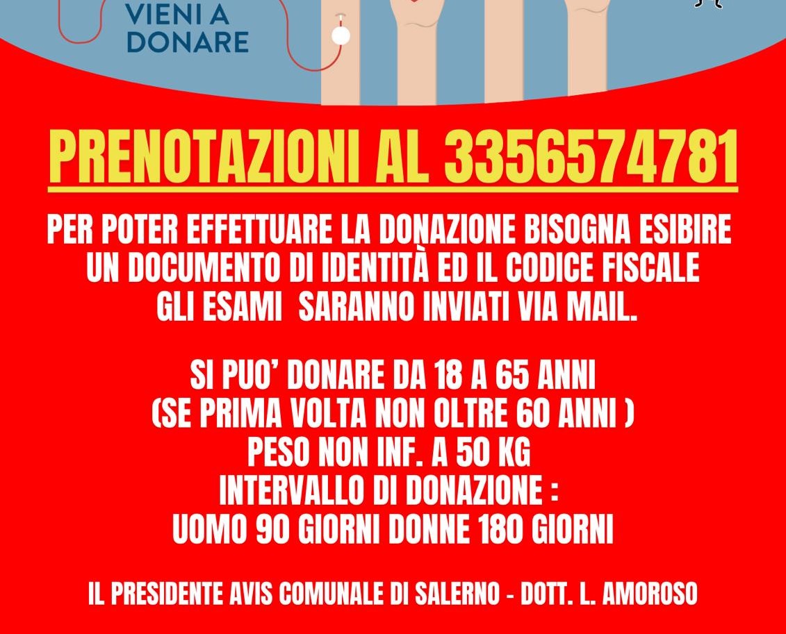 Sabato 18 gennaio p.v. sarà possibile donare il sangue dalle ore 8 alle ore 10.30 nei pressi di Palazzo Mezzacapo nell'area antistante al monumento di San Pio grazie all'Avis Comunale Salerno Per poter effettuare la donazione bisogna esibire un documento di identità ed il codice fiscale gli esami saranno inviati via mail.
