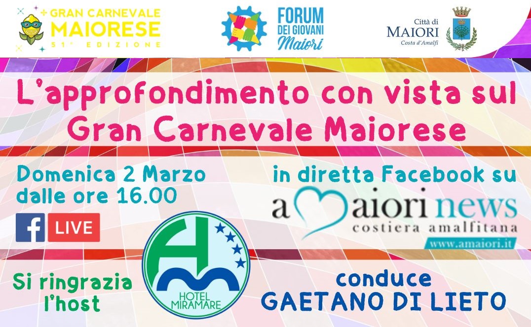 Domenica 2 Marzo dalle ore 16.00, in concomitanza con la seconda sfilata pomeridiana dei Carri allegorici della 51^ edizione del Gran Carnevale Maiorese, andrà in diretta streaming #ForumDalBalcone il nuovo format pensato dal Forum dei Giovani di Maiori con il prezioso supporto tecnico e mediatico del Blog editoriale Maiori News - il portale online di Maiori e della Costiera amalfitana che ringraziamo.