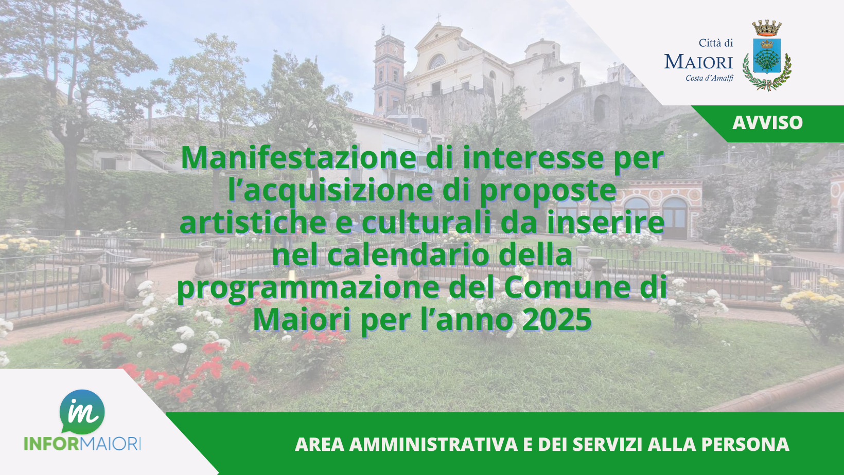 L'Ufficio turismo, con questo avviso pubblico, intende recepire proposte di progetto per l'inserimento nel cartellone di iniziative coordinato e promosso dal Comune di Maiori per l'anno 2025.