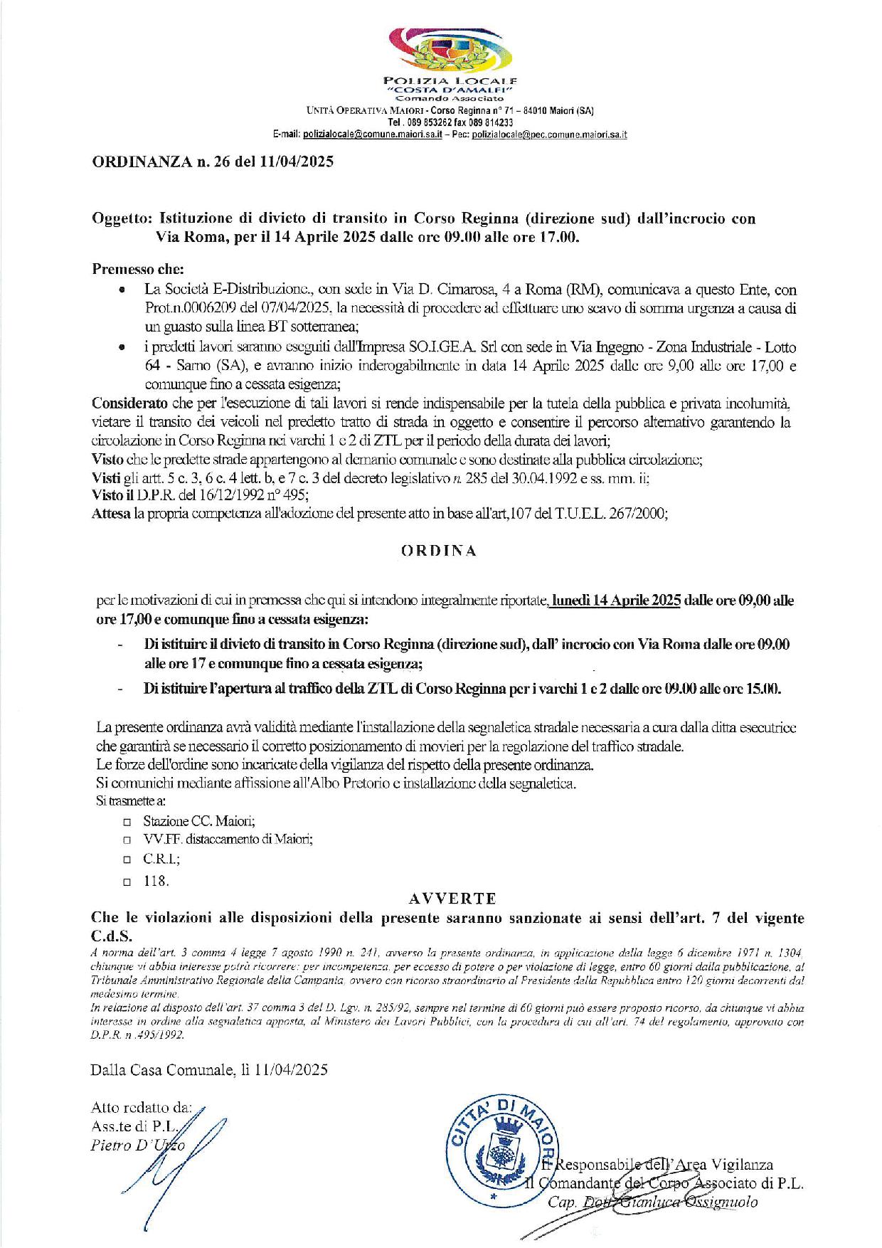 Istituzione di divieto di transito in Corso Reginna (direzione sud) dall'incrocio con Via Roma, per il 14 Aprile p.v. dalle ore 09.00 alle ore 17.00