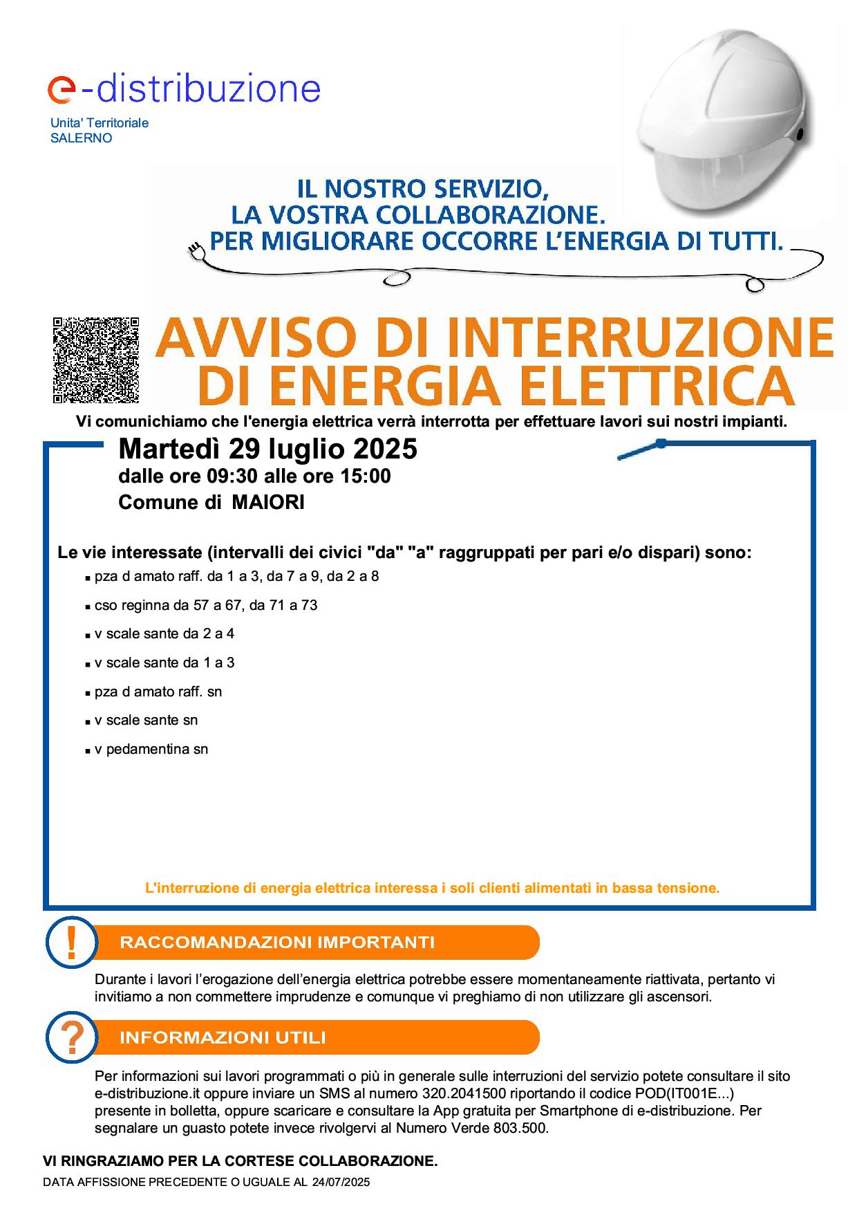 Avviso interruzione energia elettrica programmata per il giorno 29 luglio p.v.