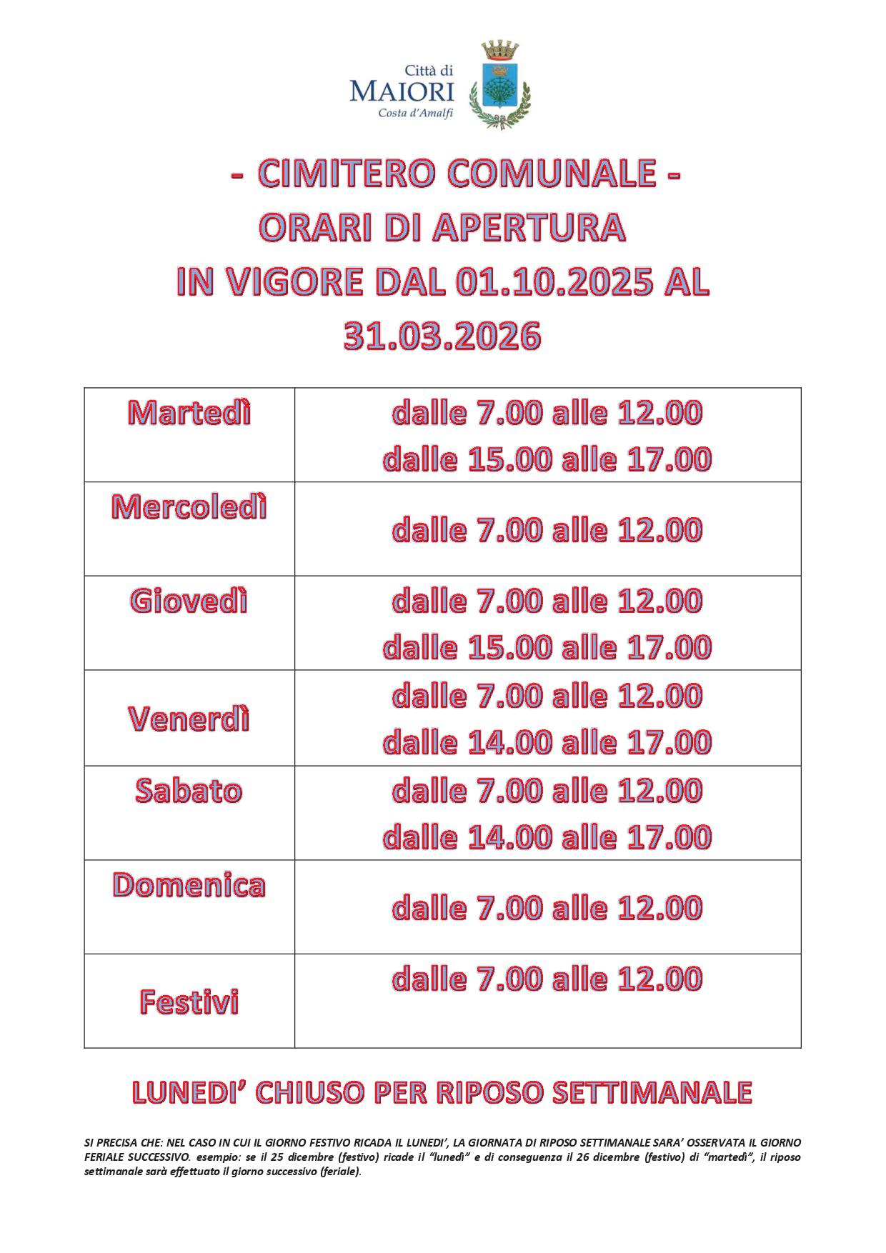 Orari di apertura del Cimitero Comunale validi dal 01.10.2025 al 31.03.2026