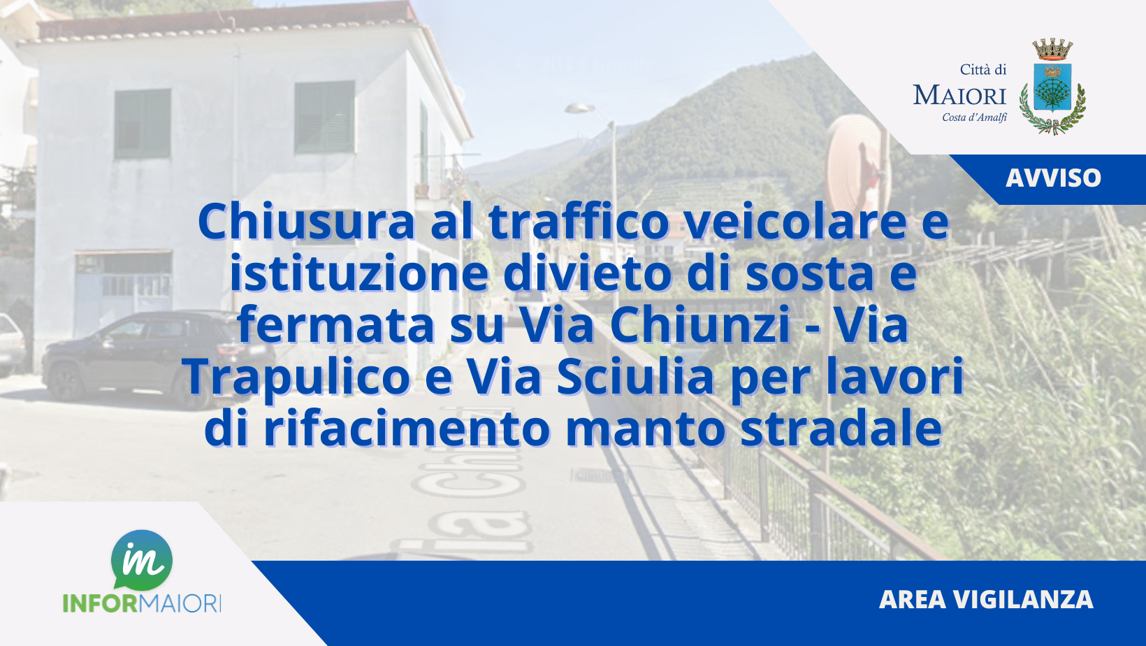 - il divieto di transito e il divieto di sosta e fermata di tutti i veicoli in via Chiunzi nel tratto compreso tra l'incrocio con Via Discede e l'incrocio con Via Nuova Prov. Chiunzi (SP2) e in Via Trapulico;