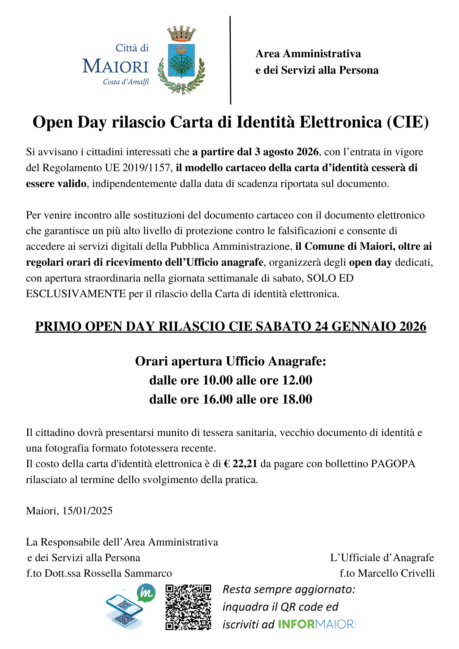 Open Day rilascio Carta di Identitą Elettronica (CIE) sabato 24 gennaio p.v.
