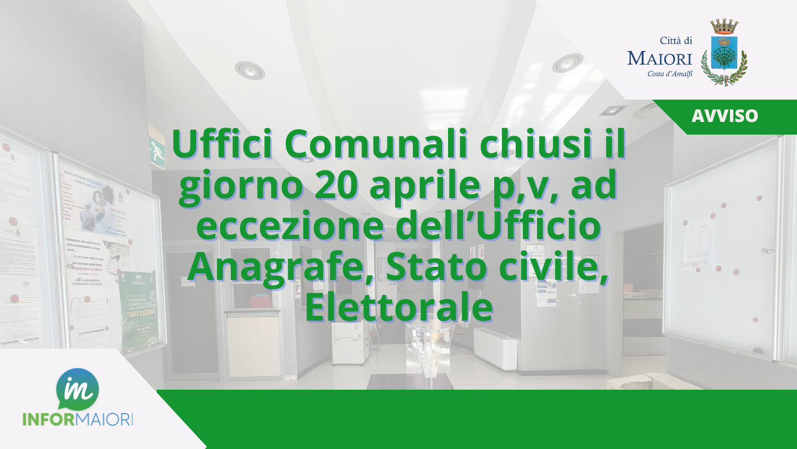 Si informa la cittadinanza che il giorno 20 aprile 2026 gli Uffici Comunali – ad eccezione dell’Ufficio Anagrafe, Stato civile, Elettorale - resteranno chiusi al pubblico per espletamento di corso di formazione del personale.
